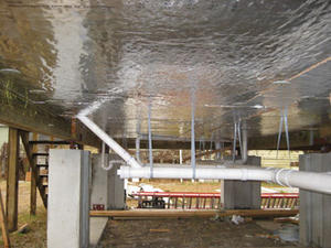 Foundation and Floor Assembly: Concrete grade beam and adjustable pier foundation, joist-framed floor on sill beam with R-13 floor insulation: 2” foil-faced polyisocyanurate insulating sheathing installed below floor joists (all joints taped to maintain air barrier), 1/2” fiber cement protection board installed below insulating sheathing.