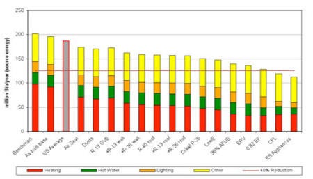 The various mechanical and enclosure upgrade options were explored through a series of parametric annual loads studies. The studies show the percent improvement of each successive upgrade relative to the benchmark. The final study shown above outlines the mechanical and enclosure upgrades and indicates the Westford House, as designed, achieves a 44.1% source energy reduction relative to the benchmark, giving the home a HERS score of 50.