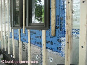 The builder demonstrated an innovative approach with the installation of the windows in alignment with the drainage plane of the wall. Wood blocking let in to exterior layer of insulation is covered by self-adhered flashing that wraps into the opening over the wood blocking and inner layer of insulating sheathing. Since the insulated sheathing used is 2” thick, the blocking is padded to the inside with 1⁄2” of rigid foam insulation. The blocking is fastened to the wall framing through the inner layer of exterior insulating sheathing. Positive drainage of the window sill pan flashing is established by cutting the foam at the bottom of the window to provide a slope. With the opening prepared, the window is installed and flashed as per typical practice with fasteners into the 2x blocking through the nailing flanges.