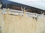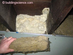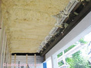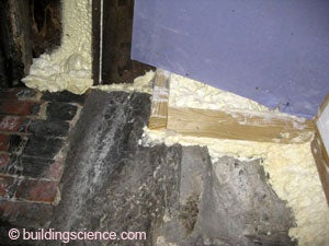 Design Challenge: Doubling Efforts This project presented interesting challenges of connecting the control functions of an exterior wall retrofit system to previous retrofit work. At the front of the building is an overhanging floor where the previous retrofit had applied closed-cell SPF. The exterior insulating sheathing added as part of the current retrofit was applied to the face of the wall and continuous through the location where the porch roof had been cut away. As seen in the photo to the right, the use of two-part kit foam does not appear to have successfully connected the new work to the previous work at the first attempt. A second application of two-part foam was needed to provide robust connections. |
