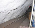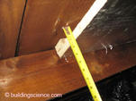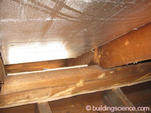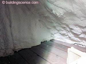 Design Challenge: Don't Touch That Slate Roof! One constraint for this project was that the slate roofing material was not to be removed. Since it could not be removed, this eliminated the option of adding insulation to the outside of the roof deck. It also meant that the water management layer under the roofing could not be inspected and, if necessary, improved. Even a slate roof that is in good condition and has proper water management details is going to allow some water to get to the underlying board sheathing. This is not a problem provided the moisture can be absorbed into the board sheathing and redistributed enough to allow drying. For this project, in order to get an insulation value close to the National Grid DER goal of R-60 while insulating only from the inside, the rafter bays needed to be filled with closed-cell foam insulation in the knee wall and sloped ceiling spaces. However, closed-cell spray foam insulation applied directly to the underside of the board sheathing severely restricts the ability to dry because there is no air gap below the boards and the spray foam is vapor impermeable. For this reason, BSC does not recommend applying spray foam directly under the roof deck of an unvented roof where the water management system of the roof cannot be verified. A remedial measure was devised for the project by placing a 1” rigid polyisocyanurate board in each rafter bay held back from the board sheathing by at least 1”. The air gap created under the sheathing supports redistribution and drying, provides a relatively high R-value, and served as the backer for the application of the closed-cell spray foam in the rafter bays. |