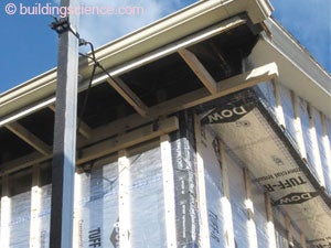 The construction process for the above grade walls of the house was fairly straightforward since the contractor was experienced with the installation of exterior insulating sheathing and the detailing required for the outer layer to be a drainage plane and part of the air barrier. Although the roof and overhangs were not modified in this retrofit, there were places where special handling was required because the existing overhang was barely sufficient to cover the extra thickness of the retrofitted exterior wall.