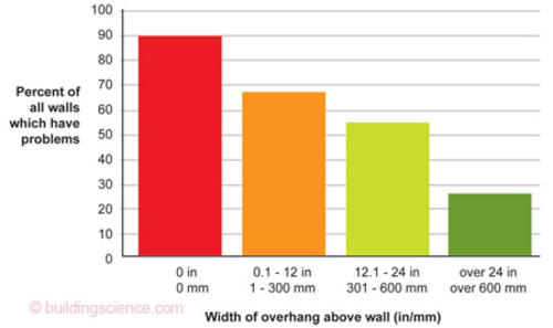 The shape of the roof and overhangs also have a critical impact. Field measurements [1] and computer modelling [2] have shown that overhangs and peaked roofs reduce rain deposition by approximately 50%.  A damage survey of wood frame buildings in British Columbia [3] found that the size of a buildings overhang correlated directly with the probability of rain-related damage (Figure 1).