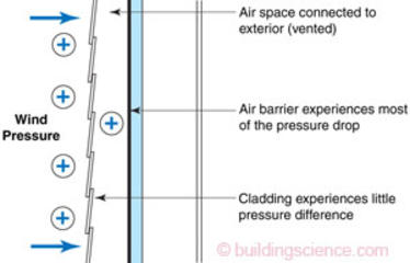 A vented airspace also allows for both some degree of pressure moderation. Pressure moderation is the term given to the mechanism whereby wind pressure differences across the cladding are reduced by connecting an air space behind the cladding with the wind-induced pressure acting on the exterior (Figure 7). By reducing air pressure differences across the cladding, rain will not be forced across openings by this force, while the standard features of capillary break, drainage, and flashing deal with the other rain penetration forces. If the air pressure is completely eliminated (not practical in the field [12,13,14]), the process is termed pressure equalisation.