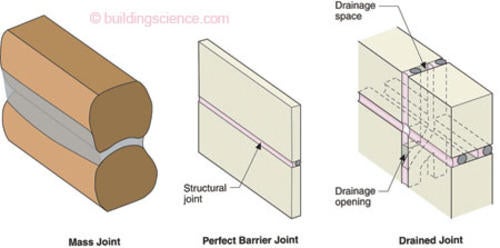 Joints between the wall and penetrating items or between joints within components (such as between the window frame and glazing) can use any one of the three strategies applied to walls (Figure 9). Joints are often designed as face-sealed perfect barrier elements made of sealant. These joints have a very high chance of failure, and may defeat the otherwise good performance of a drained or storage wall system. They are not recommended.