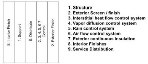 In most practical construction, the enclosure is assembled from numerous layers, and increasingly, these layers have a specific function. For housing, the following break down is useful