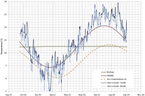 This wall was analyzed in WUFI to predict the moisture related risk in the wall system, and it was shown that the RH at the surface of the XPS in the above grade portion of the wall is elevated in the winter months (Figure 2), and that there is some condensation potential alternating with periods of drying potential at the top of the foundation wall. (Figure 3). There is little risk of moisture related issues in this all system if the interior RH is controlled with a dehumidifier, and the interior drywall is well air sealed.