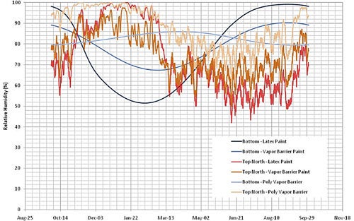 Figure 3 shows the relative humidity levels at the interior surface of the XPS which are significantly lower than the surface of the concrete in High-R Foundation 3. The relative humidity is shown to be a function of the vapor control on the interior surface, with vapor barrier paint (approximately 1 perm) performing better than latex paint or a polyethylene vapor barrier. Even with just latex paint, the risk of moisture issues is minimal, if the relative humidity in the basement is controlled.