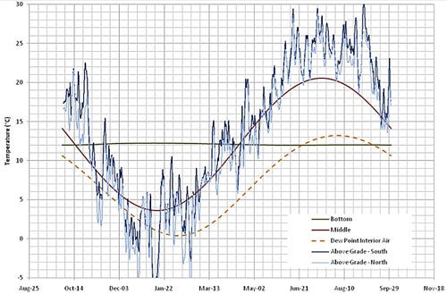 The XPS insulation also increases the temperature of the condensation plane, minimizing condensation of elevated interior relative humidity. Figure 2 shows that there is still potential for moisture condensation but it is significantly less than High-R Foundation 3.