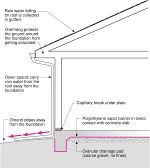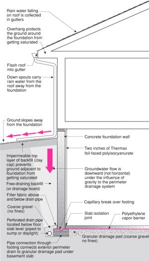 - Drain groundwater away in sub-grade perimeter footing drains before it gets to the foundation wall