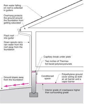 - If the interior crawlspace is lower than the exterior grade, a sub-grade perimeter footing drain is necessary as in a basement foundation