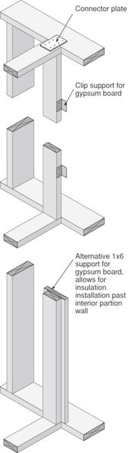 Similar to exterior corners, adding additional stud framing for drywall support where partition walls intersect exterior walls creates unnecessary material use and unnecessary thermal bridges. The diagram to the right shows how dry wall support at this intersection can be provided by drywall clips or a 1x6 (alternately, a strip of plywood could be used) attached to the back of the partition’s terminal stud. These measures allow insulation of full, or nearly full-, cavity depth to continue past the intersection. Structural connection between the partition wall and the exterior wall can be achieved by a connector plate at the top of the wall and nailing into the floor sheathing at the bottom of the wall.