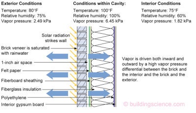 Water vapor control is particularly important for reservoir claddings that may be exposed to sunshine—even in predominantly heating climates.  When absorbent cladding materials or retained water in the drainage space is heated by solar exposure, very large inward water vapor drives can result. These inward drives can cause dangerous summertime condensation within wall cavities, especially if a low-permeance vapor barrier (e.g., polyethylene) or finish (e.g. vinyl wall paper, mirrors, and cabinets) are used on the interior. There are two methods of controlling this vapor drive: 1) ventilate the cladding, and 2) provide a vapor control layer behind the cladding. These may also be used in combination for situations of elevated moisture loading.