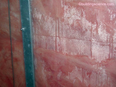 Plastic vapor barriers are a “no-no” on the inside of wall assemblies with reservoir claddings everywhere in the Lower 48 States. Many old timers intuitively knew this and were passionate about using kraft-faced batts rather than polyethylene. Kraft-faced batts act as vapor “retarders” rather than vapor “barriers” in cold climate wall assemblies (Photograph 11). The kraft-faced batts allowed the wall assemblies to dry inwards during the summer especially when the assembly was “stressed” by inward vapor drive out of a reservoir cladding. It appears that mostly the young got “sucked in” to the plastic vapor barrier craze.