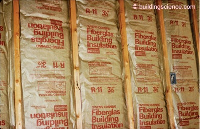 Photograph 11: Kraft-Faced Batts—Bless old timers and common sense—the kraft facing breathes during the summer allowing inward drying—polyethylene vapor barriers do not.