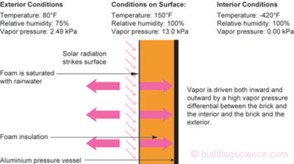 Figure 1: Boundary Conditions—A film of rainwater on the surface of solar heated foam insulation leads to enormous vapor drives.