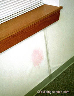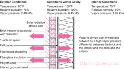 Incident solar radiation heats the water stored in the cladding creating a huge vapor drive that is both inward and outward (Figure 2). The vapor drive inward out of a solar heated rain wetted reservoir cladding located in a building in Chicago in July dwarfs by several hundred percent the outward vapor drive in a humidified building located in Barrow, Alaska in January when it is minus 40.5 This leads to summer condensation on the cavity side of polyethylene vapor barriers in places like Chicago (Photograph 9) and Minneapolis (Photograph 10).