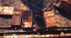 No one argues that it is a dumb idea to shove a bunch of fiberglass batts into a cathedral ceiling with no provision for ventilation air to remove moisture that leaks in from the interior. The results are often catastrophic (Photograph 6). No matter how good we are at air sealing the interior gypsum board ceiling we can’t quite get it “perfect enough” consistently to stay out of trouble. We can get lucky on one in 10, but that is not a high success rate. I mean it is possible to get a blindfolded drunk to cross Niagara Falls on a high-wire without a net, but it wouldn’t be a good idea.8 Note that not only did we insulate the roof cavity, but we also did our best at air sealing as well with caulks and foams and whatever, and it still did not work. So, what makes us think that we can dense pack a cathedral ceiling and get it to work without any attempt at air sealing?