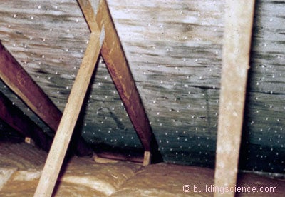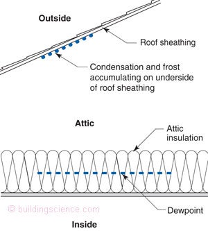 Figure 2: Attic Sheathing—Underside of the attic roof sheathing is where the action is, not at the dew point location in the ceiling insulation.
