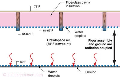 How about vented crawlspaces? Ah, we typically have two “condensing surfaces of interest”: the underside of the cavity insulation in the floor joists (Photograph 5) and the top surface of the ground cover (Photograph 6). What is going on is that the outside air dew point temperature is above the ground surface temperature for several months of the year. The ground surface temperature governs what happens in the crawlspace because it pretty much determines what the temperature of the underside of the insulated floor assembly is. The underside of the insulated floor assembly is within one or two degrees of the ground surface temperature because the two surfaces are radiation coupled (Figure 3). So, how do you figure out the ground surface temperature in a crawlspace? Easy. A reasonable rule-of-thumb to estimate crawlspace ground surface temperatures is to use the average annual ambient air temperature for that location.