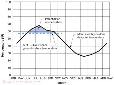 You actually could do a simple analysis to determine risk. Plot the average outside dew point temperature of the location over the course of a year versus the ground surface temperature in the crawlspace. The temperature of the ground surface in the crawlspace we already know to be pretty much the average annual ambient air temperature for that location (Figure 4). I picked Richmond, Va., for the example. Pick one for yourself and do the same thing. Pretty risky in most locations, eh? Notice, there was no real calculation involved, just plotting some temperatures and using some judgment.