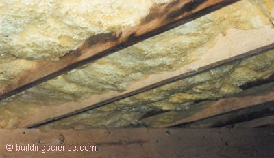 Figure 3: Vented Crawlspace—Moisture accumulates on the underside of the fluffy stuff and on the top side of the plastic ground cover because both of those surfaces are below the dew point temperature of the air in the crawlspace, which is really outside air because that is where it came from.