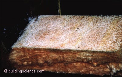 Photograph 1: Surfaces are Where the Action Is—The frost has accumulated at the backside of the sheathing, not in the middle of the cavity insulation.