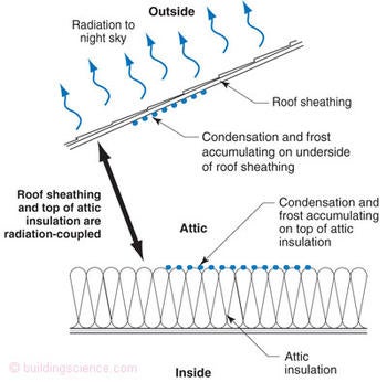 Figure 5: Night Sky Radiation and Vented Attics—This is pretty neat. The roof deck is a couple of degrees colder than the outside air temperature due to night sky radiation. This also drops the temperature due to night sky radiation. This also drops the temperature of the top surface of the attic insulation. The outside dew point is very close to the outside air temperature during the winter. When exterior air is brought into a well-insulated attic assembly, the dew point of this air is sometimes above the surface temperature of the underside of the roof deck and the top surface of the attic insulation.