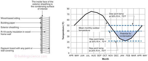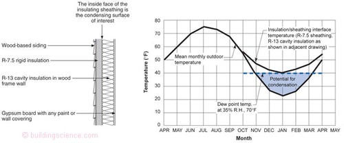 Figure 7: Insulating Sheathing Rocks—The insulating sheathing raises the temperature of the condensing surface of interest. This is a good thing.