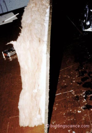 I remember a great little experiment done for the benefit of us newbies in 1982 at my alma mater, the University of Toronto, by Professor John Timusk (a.k.a. “JT” by his grad students). A wood frame wall with fiberboard on one side, fiberglass insulation in the cavities and nothing on the other side was put into a climate chamber. One side was maintained at 0°F (-18°C) and the other 70°F (21°C) at 50% RH. Quick, what’s the dew point temperature of 70°F air (21°C) at 50% RH? Where is my psychrometric chart? That would be around 50°F (10°C).