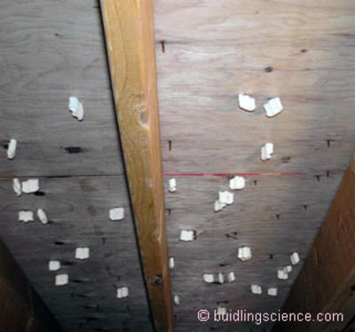 And further still the “condensing surface of interest” in a roof assembly is typically the underside of the attic roof sheathing (Photograph 3) not the middle of the roof insulation (Figure 2). Actually, the nails see the condensation first, then the sheathing. Photograph 4 is what happens when someone has too much time on their hands.