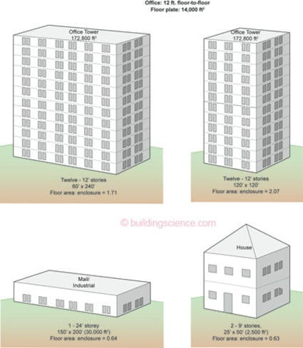 Another metric, preferred by this author for commercial buildings, is the ratio of the usable floor area, F, to above-grade enclosure area E. The more compact the form, the higher the ratio F/E. By explicitly removing volume from the assessment, this metric rewards buildings that require less floor-to-floor height. Maximizing ceiling height relative to floor-to-floor height is also always desirable from a resource use and first-cost perspective. Most building uses (such as office, education, retail)1 do not require volume for their function, and are not sold or leased on a volume basis: it is floor area that matters. This metric also does not include the ground contact area, but does include the roof. The ground is always at a more moderate temperature difference than walls or roofs, and is not affected by solar radiation, therefore the slab and basement influence on decisions should be de-rated. The roof is also different in that it is usually easier to insulate to a high level. Counting the full roof area and not counting the slab area is intended to approximately balance the impacts.