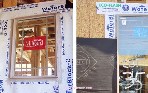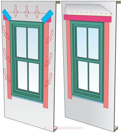Figure 1: Water Entry at Window Opening (left) – It is important to address water running behind building wraps and housewraps at window heads and the sides of window openings.