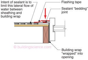 At the sides of windows we use a “bedding joint”. I love this term. A heavy bead of sealant is installed behind the flange of a window and it acts like a “gasket” smushing the building wrap against the sheathing limiting the water that can run sideways into the opening (Figure 3).