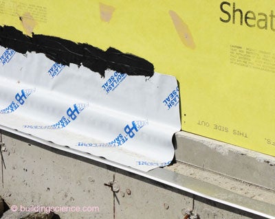 One of the dirty little secrets that never gets talked about is that water leaks through building papers, building wraps and housewraps and runs down between them and the sheathings that they cover. The water enters through nail holes and staple holes and sometimes just through the field of the material if you have a poor product.1 The good news is that the nail holes and staple holes don’t leak too much and we know how to handle the incidental leakage.