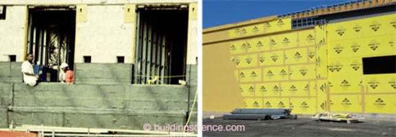 Photograph 9: Foam Sheathing (above right) - Foam plastic sheathing panels are taped together creating a water-resistive barrier system. These systems are now around 20 years old. This image dates back to a subdivision development in Chicago in 1995. 3M was one of the first to develop acrylic based tape system for housewraps in the 1980’s and they migrated to foam sheathings in the 1990’s.