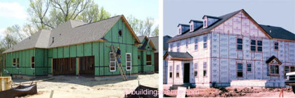 Photograph 8: Wood Sheathing (above left) - Residentially we now use tapes on wood sheathings that have factory applied membranes factory bonded to them to provide water management and air management.