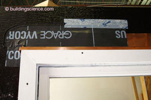 At penetrations such as windows and doors (Figure 1) we have learned to “scrape the water off the sheathing at the tops of the windows by taping the top flange of the window directly to the sheathing under the building wrap (Figure 2). This is a big deal. If we didn’t do this the water running behind the building wrap would wet the top of the window opening interior finish and folks would see it. We don’t care if this water leaks through a joint in the sheathing in the field of the wall because the wet spot isn’t seen by anyone. And if the wall is designed to dry either to the interior or exterior or both it does not matter anyway.3 Recall, that this amount of water is small.