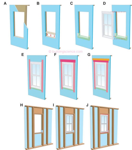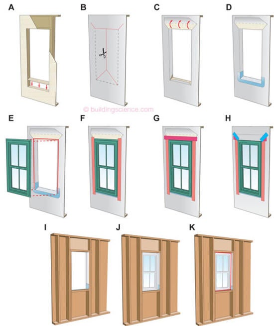A) Install beveled wood siding in frame wall opening at sill to create slope; (B) “I” cut in housewrap; (C) Fold housewrap in at jambs and sill; housewrap at head temporarily folded up; (D) Install formable flashing at sill; (E) Install sealant bead at head and jambs; install window plumb, level and square; (F) Install flashing tape at jambs; (G) Install flashing tape at head; (H) Fold housewrap down at head; tape in place with sheathing tape; (I) Interior view prior to window installation; (J) Interior view after window installation; (K) Air seal window around entire perimeter on interior with sealant and sealant backer rod