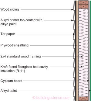 Figure 1: Yesterday’s “Old Classic” Wall - Plywood sheathing covered with tar paper over a wood frame lined with gypsum board on the inside and insulated with kraft-faced fiberglass batts. The kraft facing was really a vapor diffusion valve that opened and closed based on relative humidity. The plywood sheathing and tar paper worked the same way (see the “BSI-038: Mind the Gap” sidebar “The Magic of Plywood and the Modern Wall” and “BSI-029: Stucco Woes—The Perfect Storm Over Stucco”). So we had valves or “throttles” on both sides of the wall. Walls dried to the outside in the winter and to both sides in the summer.
