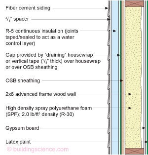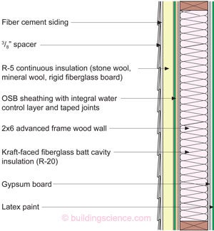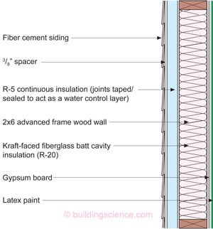 Once you get to IECC Climate Zones 6, 7 & 8 things change. You need to install at least R-5 continuous exterior insulation over the 2x6 framing to meet the thermal requirements of the 2012 IECC. And you may or may not need to install an interior Class II or Class I vapor retarder depending on stuff we still need to talk about.
