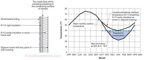 Turns out that you can get really close to the right answer if you average the average temperature of the 3 coldest months in the location of interest. If the location of interest is in Climate Zone 5 you make sure that the interface temperature stays above 35 degrees F when the interior temperature is 70 degrees F and where the outside temperature is the average temperature of the 3 coldest months. You have to realize the calculation is just a way to get you to the right amount of thermal resistance based on the real physics that came from real measurements in real experiments in the real world. But the curves and the presentation give most folks an insight as to how things work. Note that this simple calculation “tool” factors in vapor diffusion and air leakage and “incidental” wetting events. It is not a “dew point” calculation so therefore it is useful.