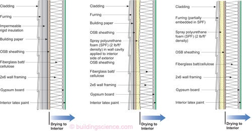 Figure 2a (above left): The “Old Plastic Wall” – The wall that kinda worked with fiberboard but not with OSB. Don’t use this wall with air-conditioning. Figure 2b (above middle): The “New Plastic Wall” – The wall that works with OSB because of the ventilated cladding. Don’t use this wall with air-conditioning. Figure 2c (above left): High Performance Plastic Wall – This wall works well. Just don’t use it with air-conditioning.