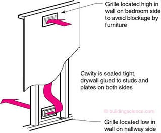 Figure 2b: Transfer Grilles – This also addresses the problem in Figure 1b. Less expensive than a “jump duct” but not as quiet.