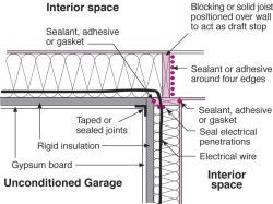 - Attached garages – the building enclosure surfaces shared between conditioned space and an unconditioned garage must have a continuous air barrier. See Figure 1 for details in terms of using sealants and rigid insulation to create a continuous air barrier between the attached garage and living space. See Air Sealing / Air Drywall Approach Details.
