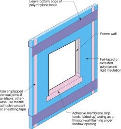 Flashing details – Both the rough opening and the window should be flashed—either one can leak. Note that installation of windows before or after the drainage plane (in this case the rigid insulation) affects the flashing sequence, how much of the flanged window extends outside the plane of drainage, and window trim details.