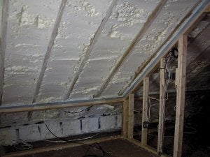 - Install high-density spray foam as the cavity insulation. Its vapor permeability is low enough that no latex paint coating is required, although gypsum wallboard or fiberglass insulation with foil facing may be required for code compliance (See the "Boston" building profile).
