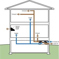 - Continuous multi-point exhaust, designed to ASHRAE 62.2P rate, pulling from each bedroom, unless the bedroom has a bathroom then it will pull from the bathroom, and pulling from at least one location in the principal living area. A fan-cycling control for the central air handler provides mixing only. Any combustion appliances must be powerdirect vented sealed combustion.
