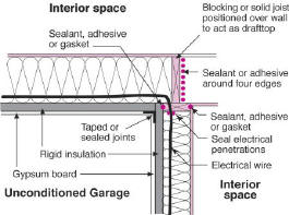 - Attached garages – The building enclosure surfaces shared between conditioned space and an unconditioned garage must have a continuous air barrier. See Figure 1 for details in terms of using sealants and rigid insulation to create a continuous air barrier between the attached garage and living space. For more details see Air Sealing / Air Drywall Approach Details.