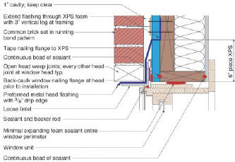 In Mixed climates, wall and roof assemblies can be designed to dry primarily to the exterior (during the heating season), to the interior (during the cooling season), or in both directions. This last, the bi-directional drying potential, is generally the preferred approach. For more detailed discussion of the three approaches, see the discussion of wall and roof design in the Builder’s Guides. Since the permeability of the latex-painted gypsum board is greater than that of the XPS rigid insulation, this wall assembly will generally dry to the interior.Rough opening flashing – Flashing must be installed at the plane of the XPS rigid insulation for drainage plane continuity. See Figure 2 and theWater Management Guide for sequential flashing details.